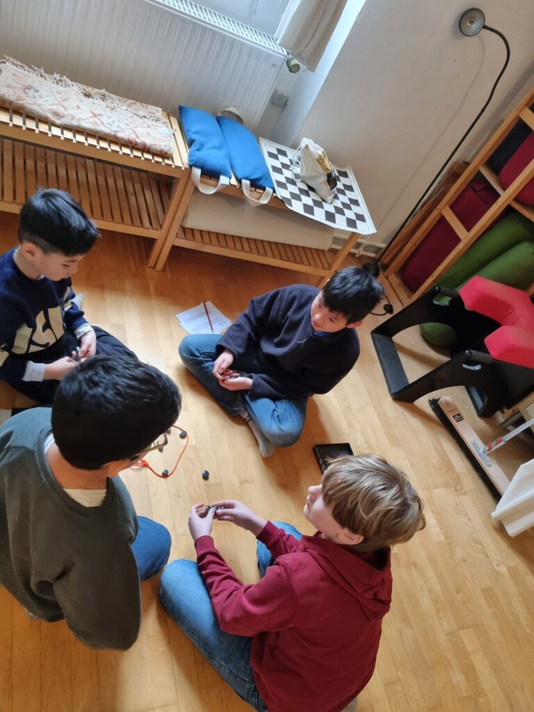 Das Wetter zeigte sich heute leider nicht von seiner besten Seite, sodass sich nur eine kleine Gruppe nach draußen zum Fangen spielen wagte. Drinnen wurde währenddessen „Kluster“ gespielt, ein Geschicklichkeitsspiel, bei dem Magnetsteine auf einer nur etwa zehn mal zwanzig Zentimeter großen Fläche abgelegt werden müssen, ohne dass sie sich berühren. Eine Aufgabe, die viel Fingerspitzengefühl verlangt und für jede Menge Spaß sorgte.